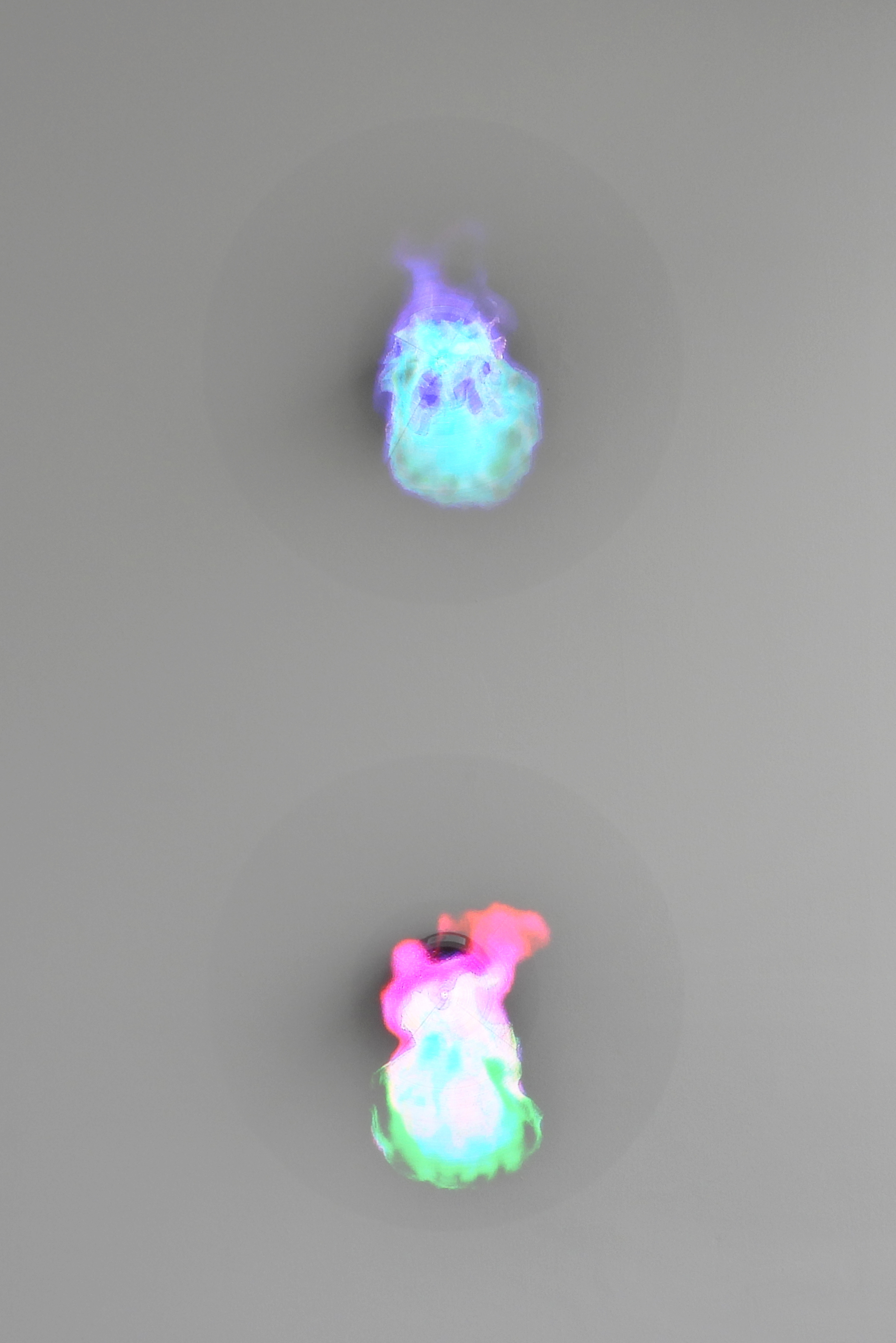 On the far wall, Light years (2022), a digital diptych has been installed, constituting a counterpart for Cabined. Light years comprises two 3D holographic fans, whirring with the two-channel animation of a blue and purple inferno. The labour involved in starting a fire is mirrored here; to create an eight minute hologram requires hours spent developing strings of code and different static frames that will merge to form a continually dancing tongue of flame. I research the process of computer-based animation and learn that the image file that contains these iterations of movement is called a sprite sheet. The animated dimension of Songsataya’s work is playful, a mode of world-building that prioritises imagination. A sprite in the gallery: a magical creature that refuses the linearity of time, or the logics of reality that it exists within.